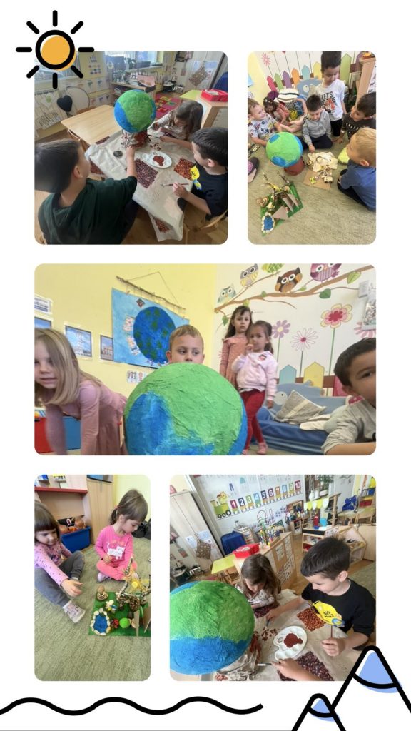 Djeca su sudjelovala u likovnim aktivnostima izrađujući Zemlju od recikliranog materijala tehnikom kaširanja, brinuli su se o biljkama te razgovarala o tome kako mogu biti mali čuvari prirode. Uz priče, pjesme i zajedničke aktivnosti razvijali smo osjećaj odgovornosti i ljubavi prema okolišu.